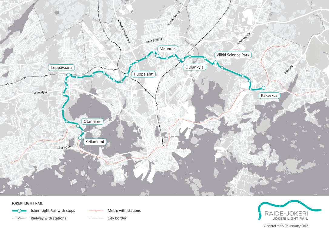 Jokeri Light Rail line will be built between Itäkeskus in Helsinki and Keilaniemi in Espoo. The planned length of the line is approximately 25 km (15.5 miles), of which 16 km will be in Helsinki and the remaining 9 km in Espoo. The light rail will replace trunk bus line 550, which is the busiest bus line in the Helsinki region.